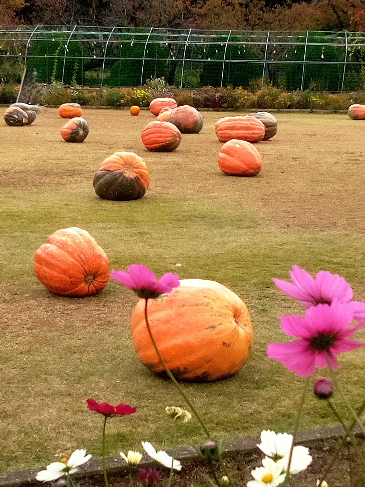 公園の芝生の上に 茨城の畑から運んできたお化けカボチャがごろんごろん