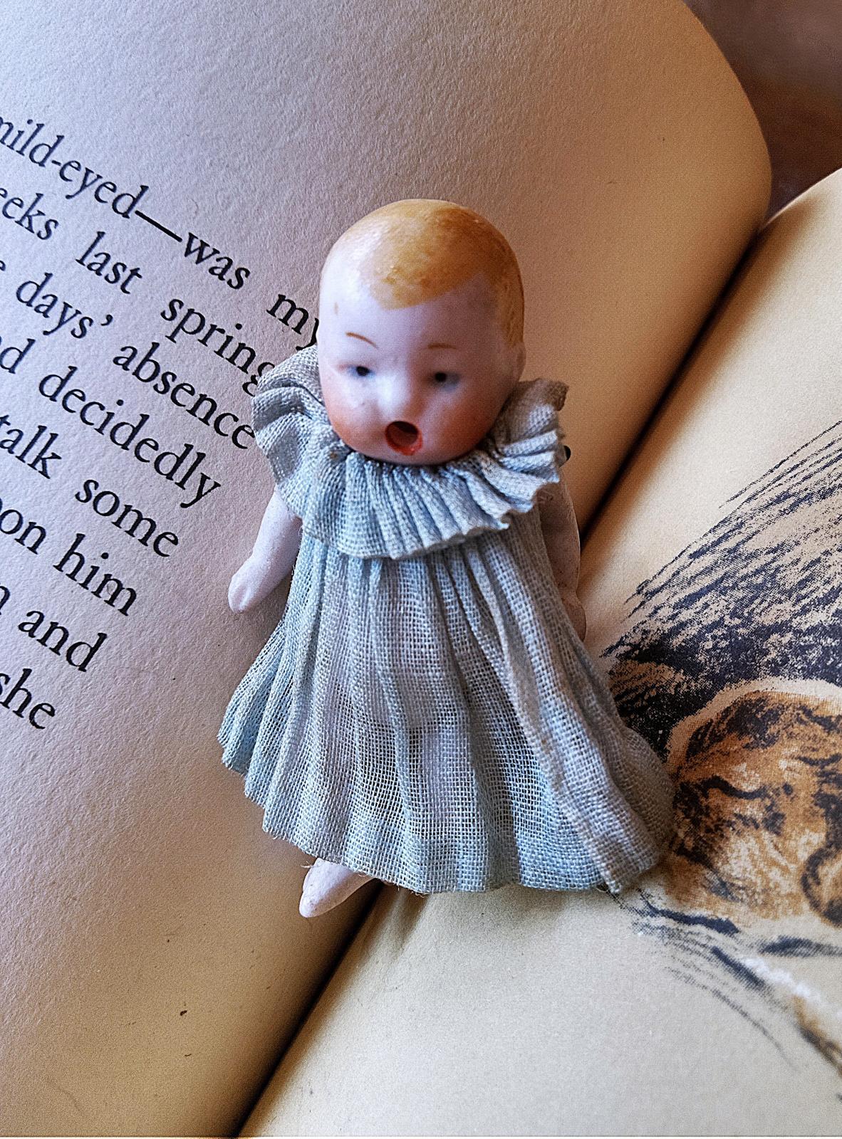 ライトブルーの袖なしワンピースと ふんわりギャザーのえり飾りがとても良い雰囲気! おしゃれな装いですね。丸く開けた紅い口からは元気な声が聞こえてきそうな 幼なさの中にもドイツの子らしいしっかりした表情が感じられますよ。