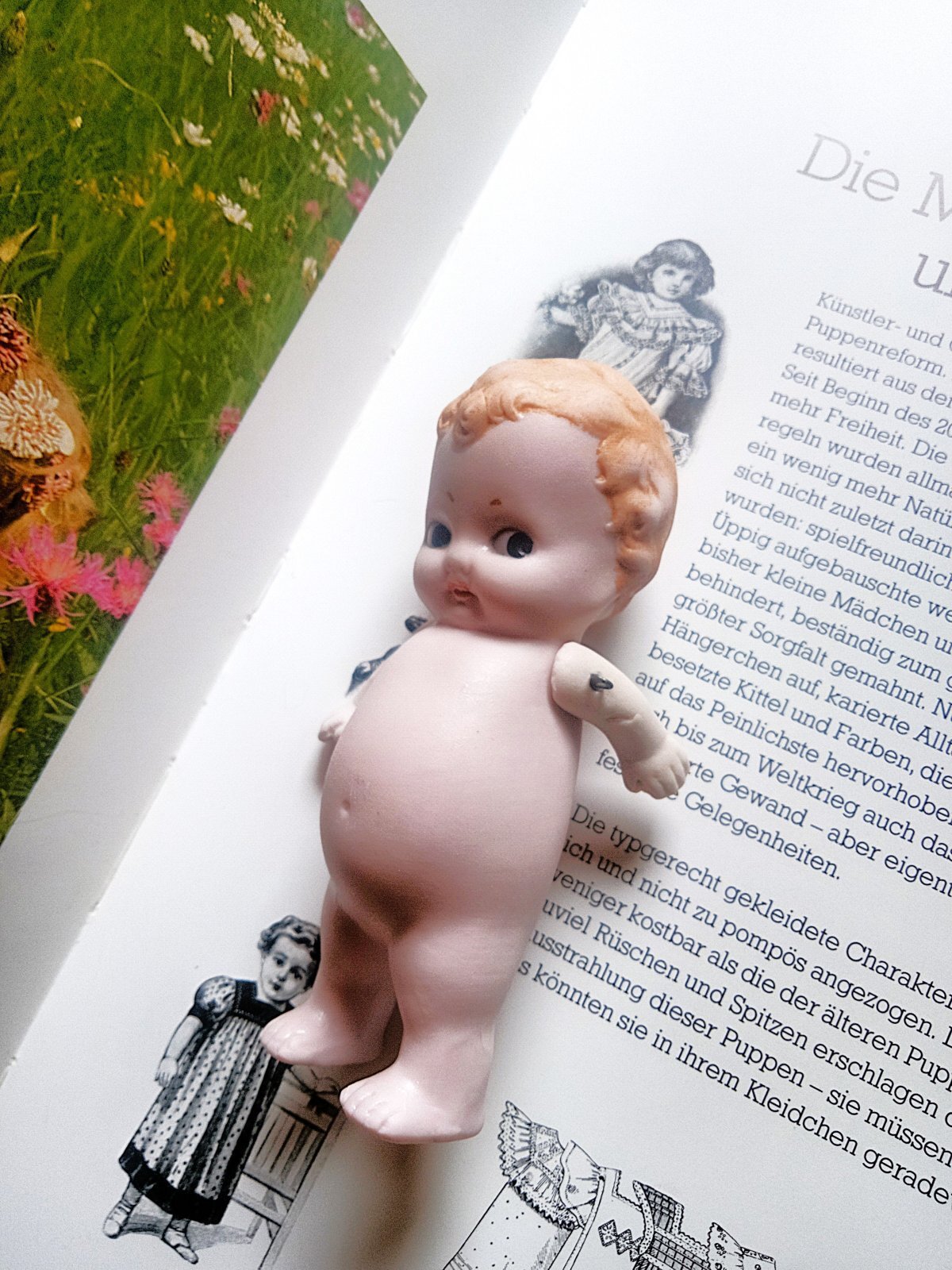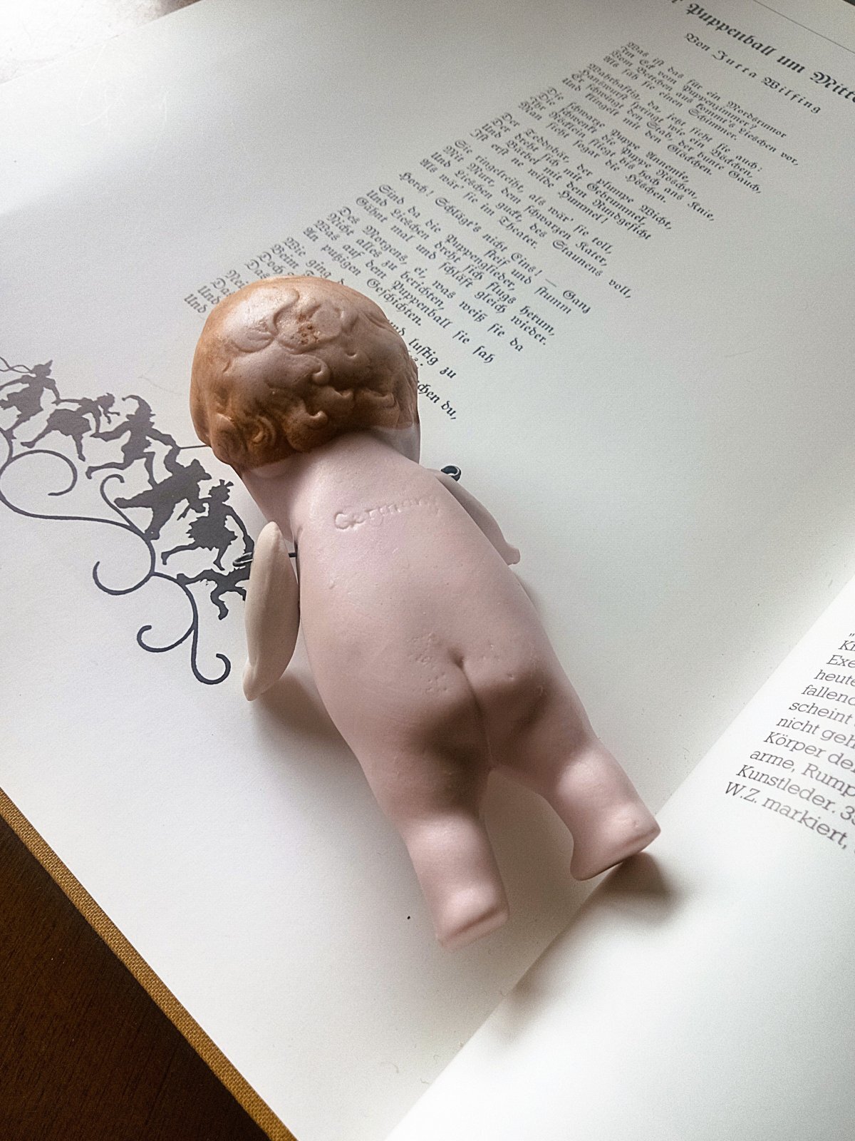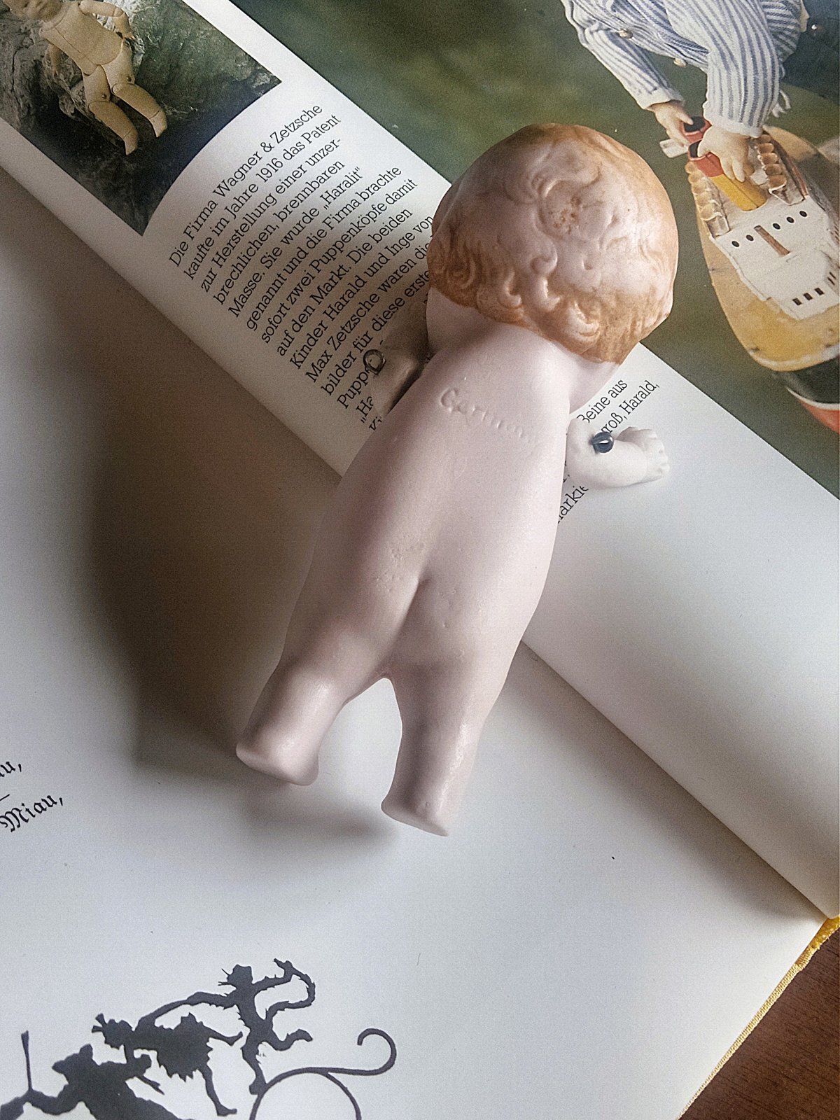 身長約11,5cm 両腕はワイヤージョイント 目・口・眉・ヘア・頬はペイント 1920年代以前 ドイツ HERTWIG 背中にGERMANYの刻印