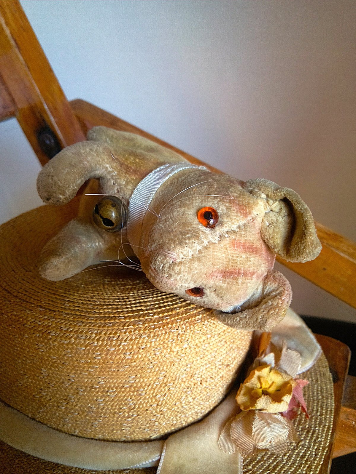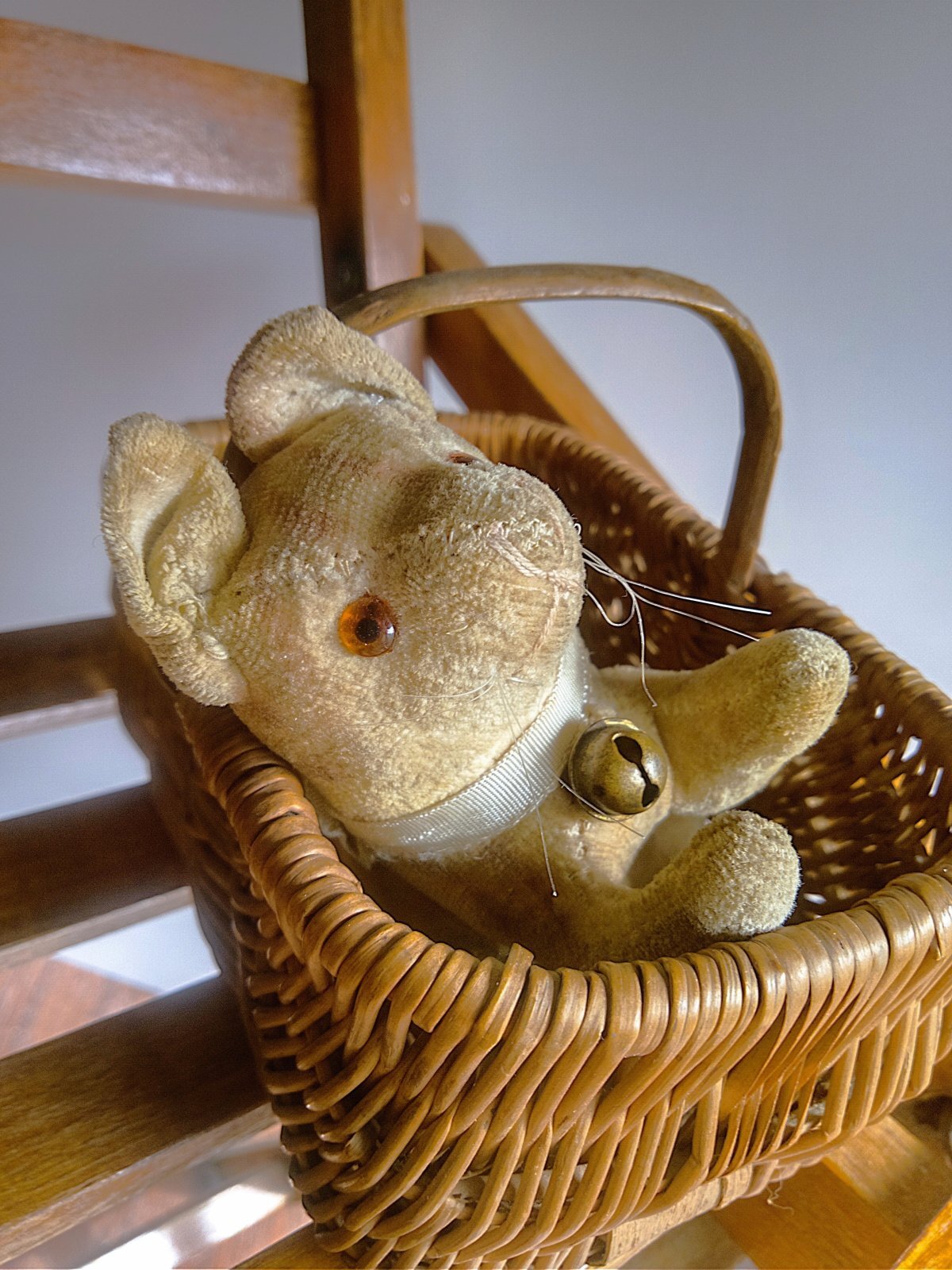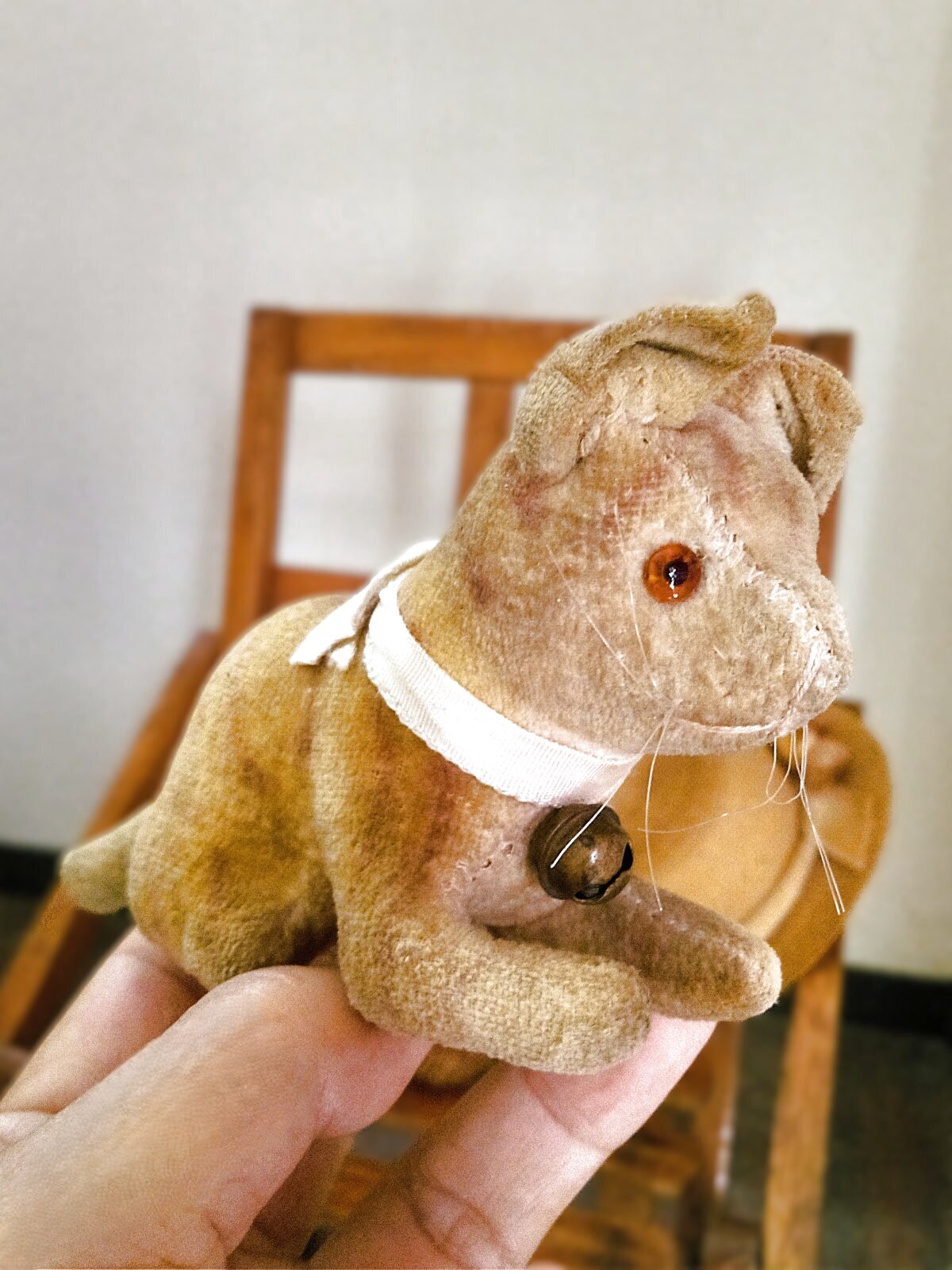 グラスアイ 鼻と口はピンク糸ステッチ 左右のひげ 鈴・リボン 1930年代以前 ドイツ
