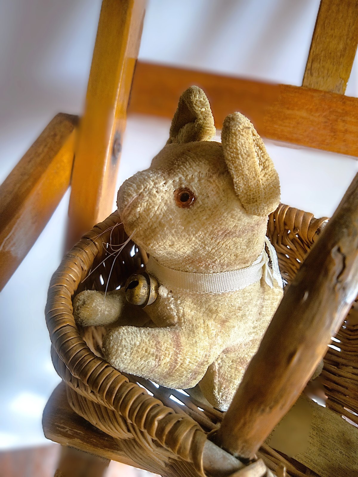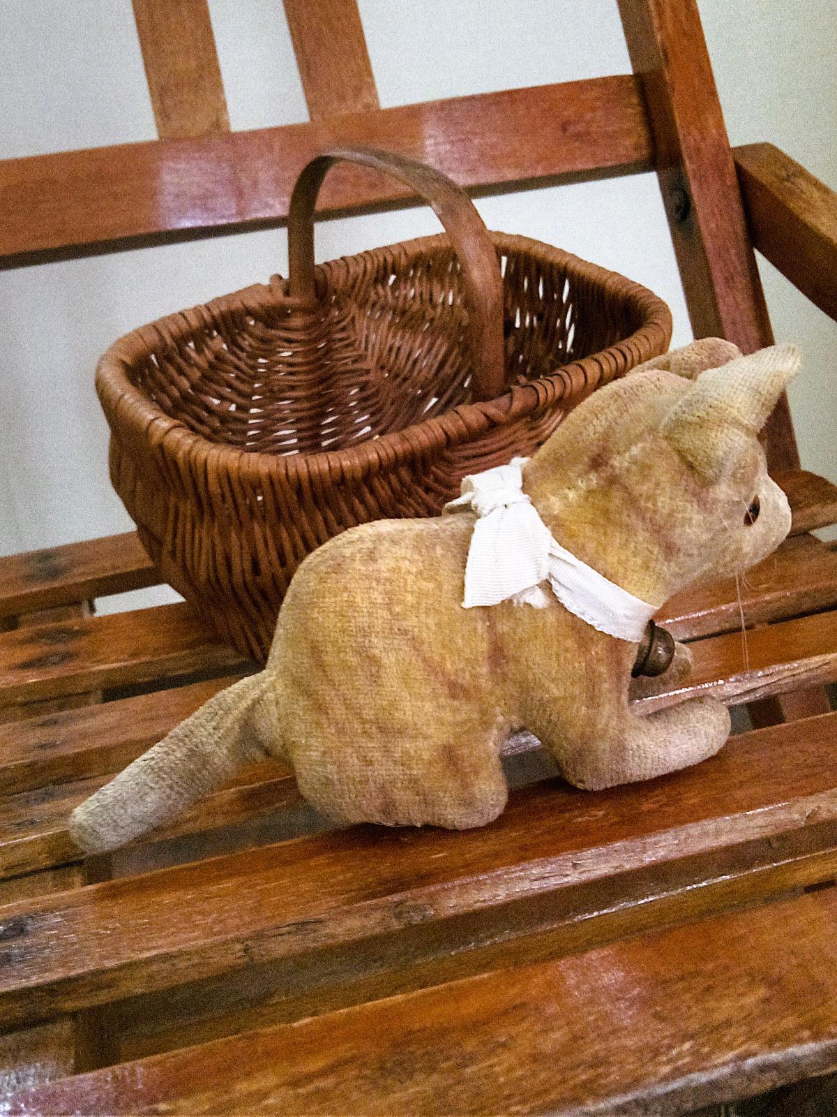 茶トラ猫だったのでしょうが、すっかり年代相応の色あせが生じています。おなかに小さな繕い跡があり、尻尾はこなれてへたっていますが、ほかは目立つような切れ・穴・よごれなどのダメージはないようです。シュタイフ社の古い猫やうさぎに 似たようなベルベット製の仔がいますね。こちらはボタンやタグが残っていないので、残念ながらメーカー不明です。ご覧の通りの古い時代の猫さんとご理解ください。