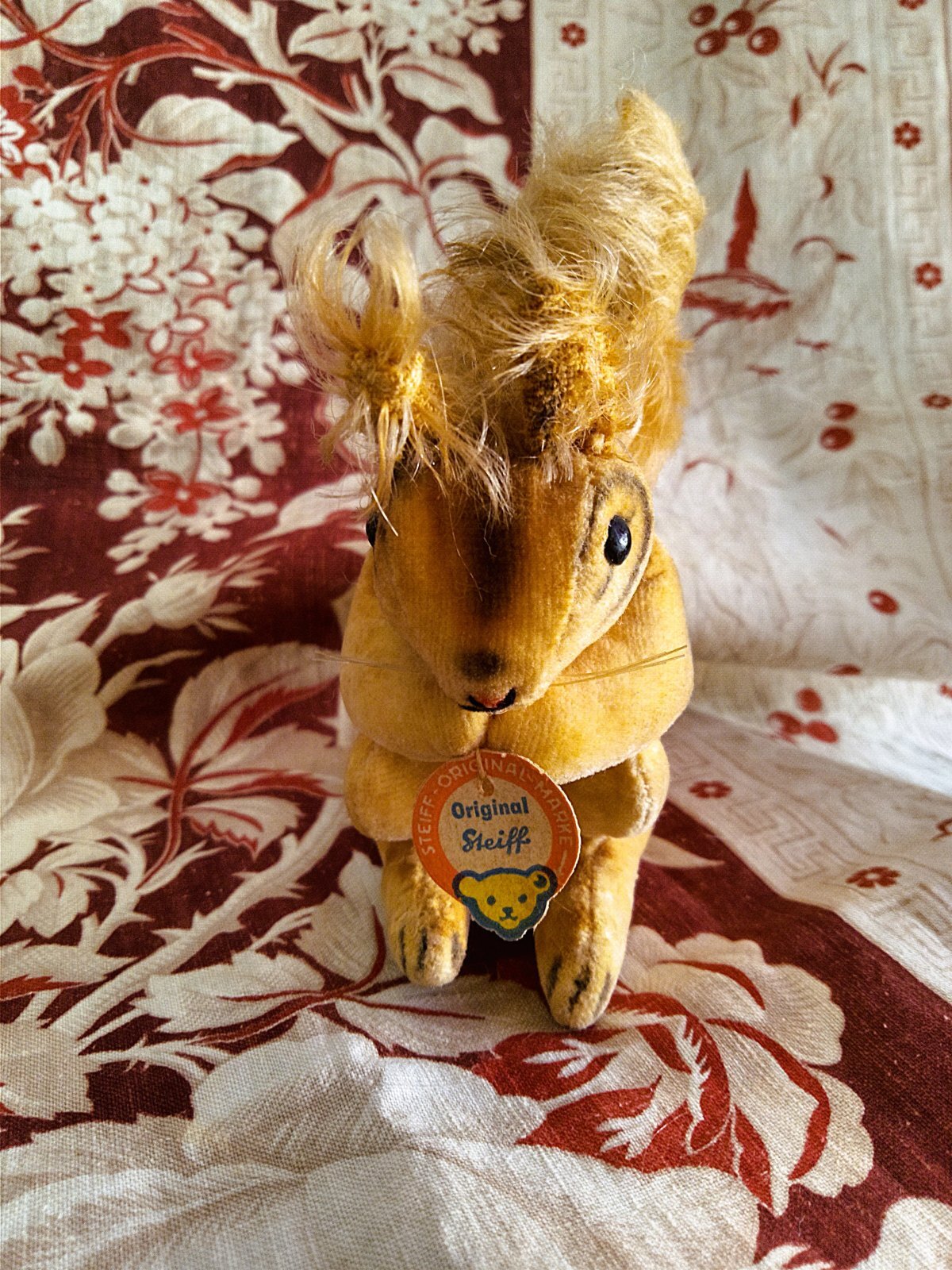コットンベルベット モヘア 木毛の詰め物 耳の先まで高さ約9cm グラスビーズアイ 鼻・口は黒糸ステッチと赤いペイント 左右のひげ 1950年代 ドイツ シュタイフ社 チェストタグ