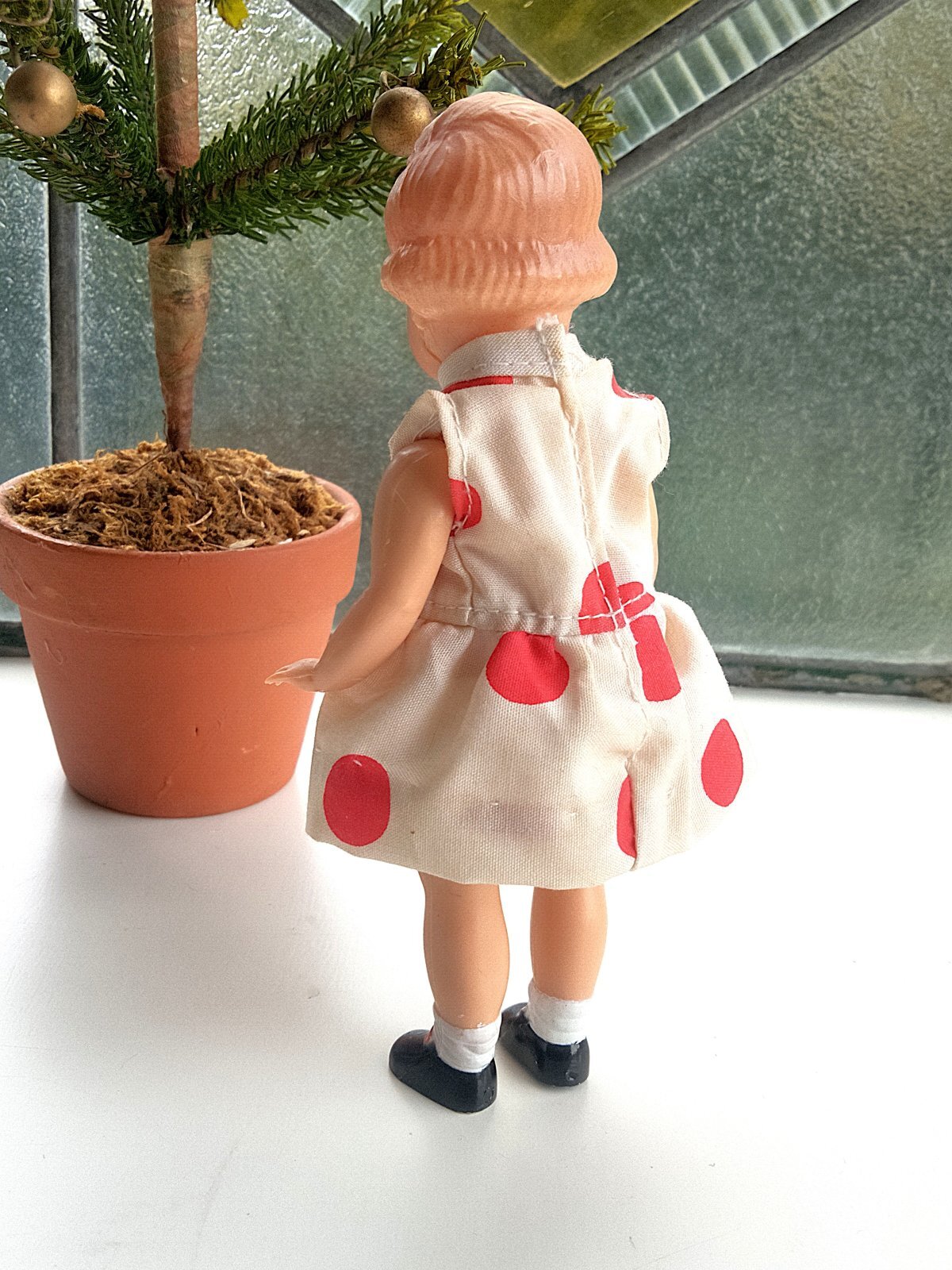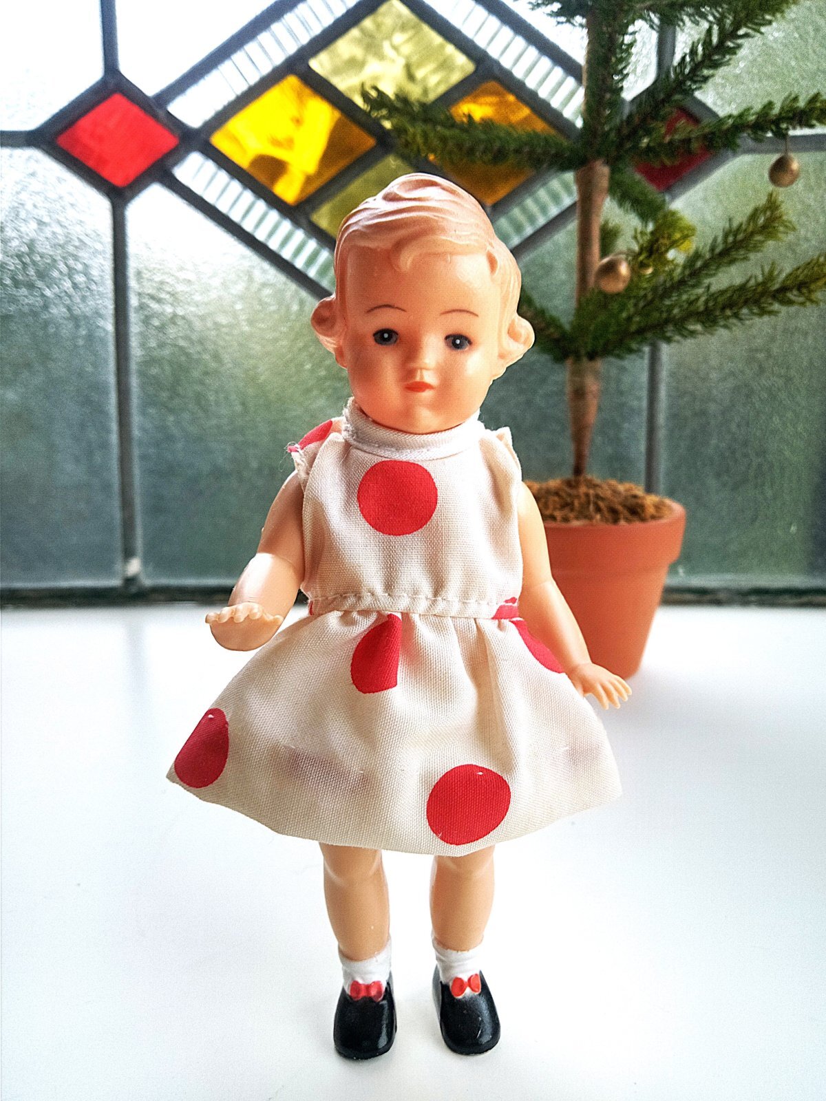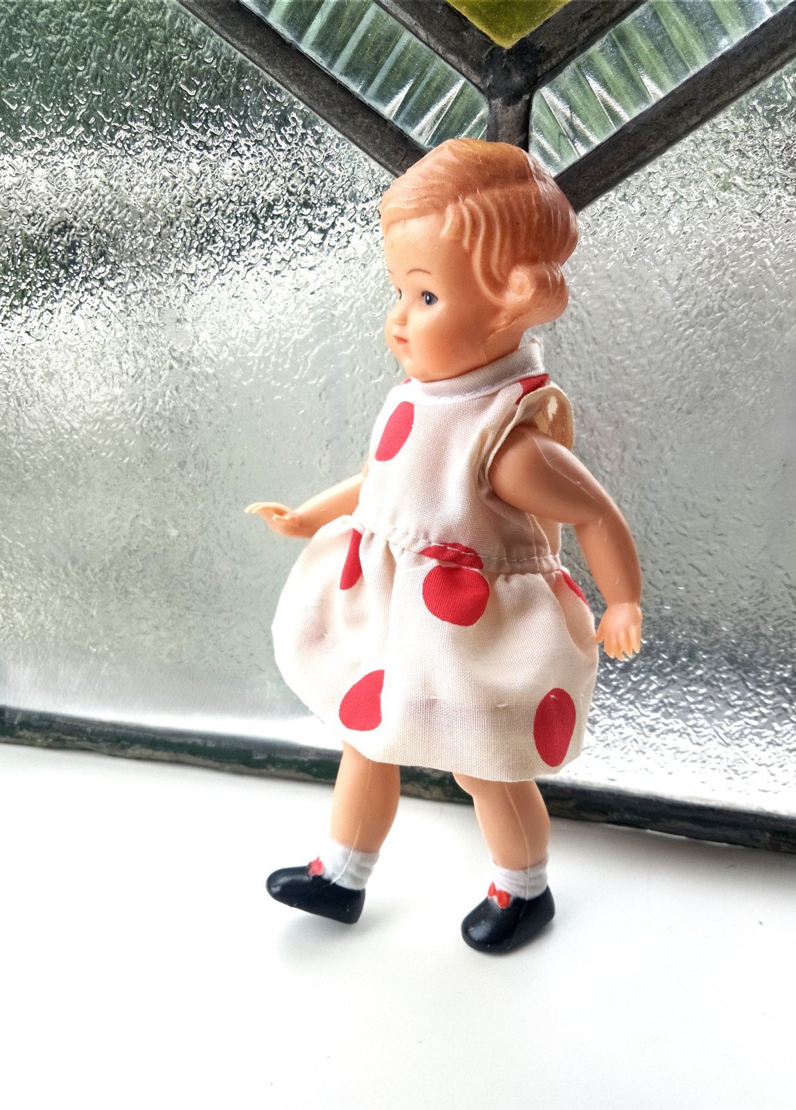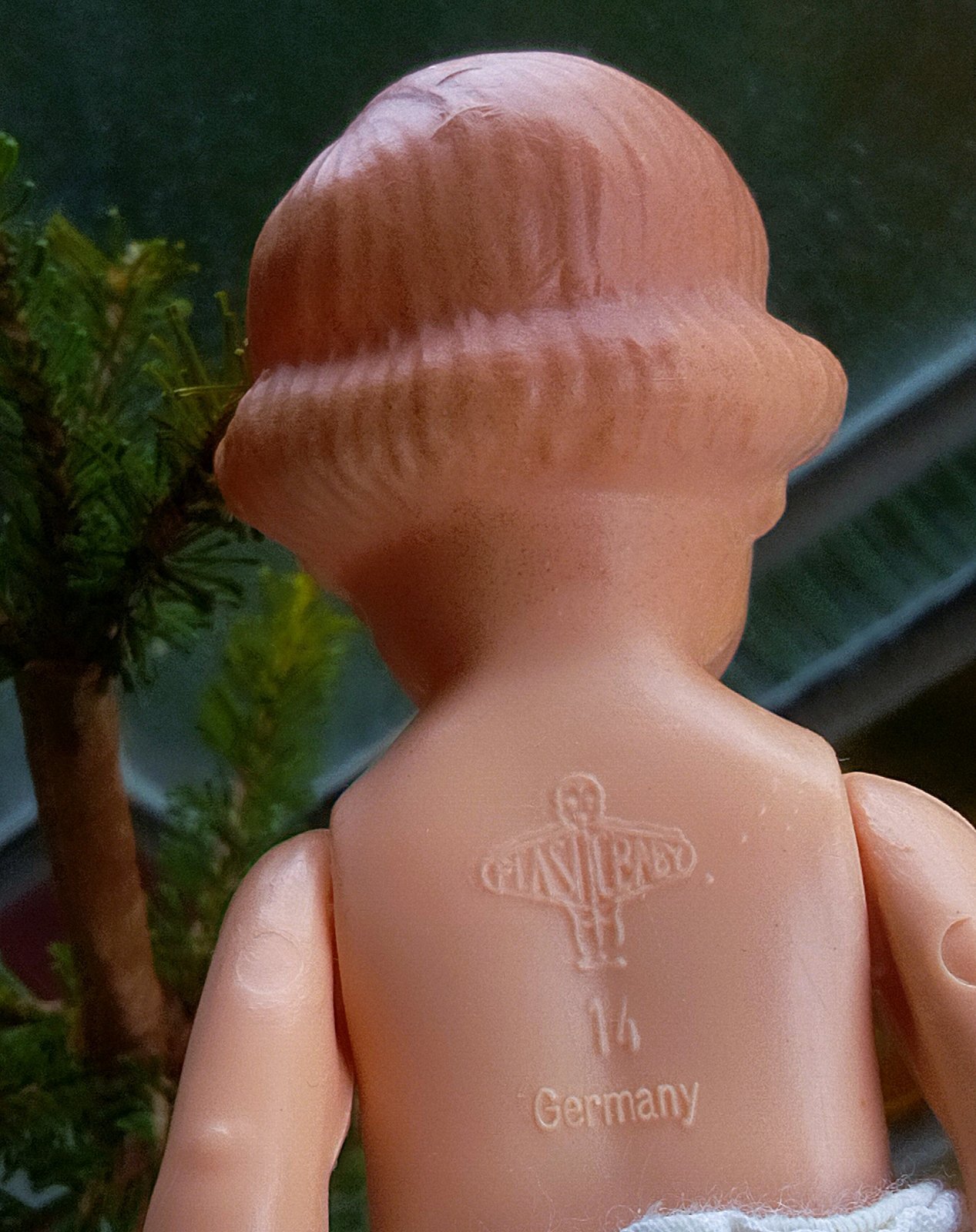 ハードプラスチック 身長約14cm 両手足はゴムジョイント ペイント仕上げ オリジナルのワンピース(背中はマジックテープ)・下着 1990年代頃? メーカーマーク plasticbaby Germany 14 の刻印