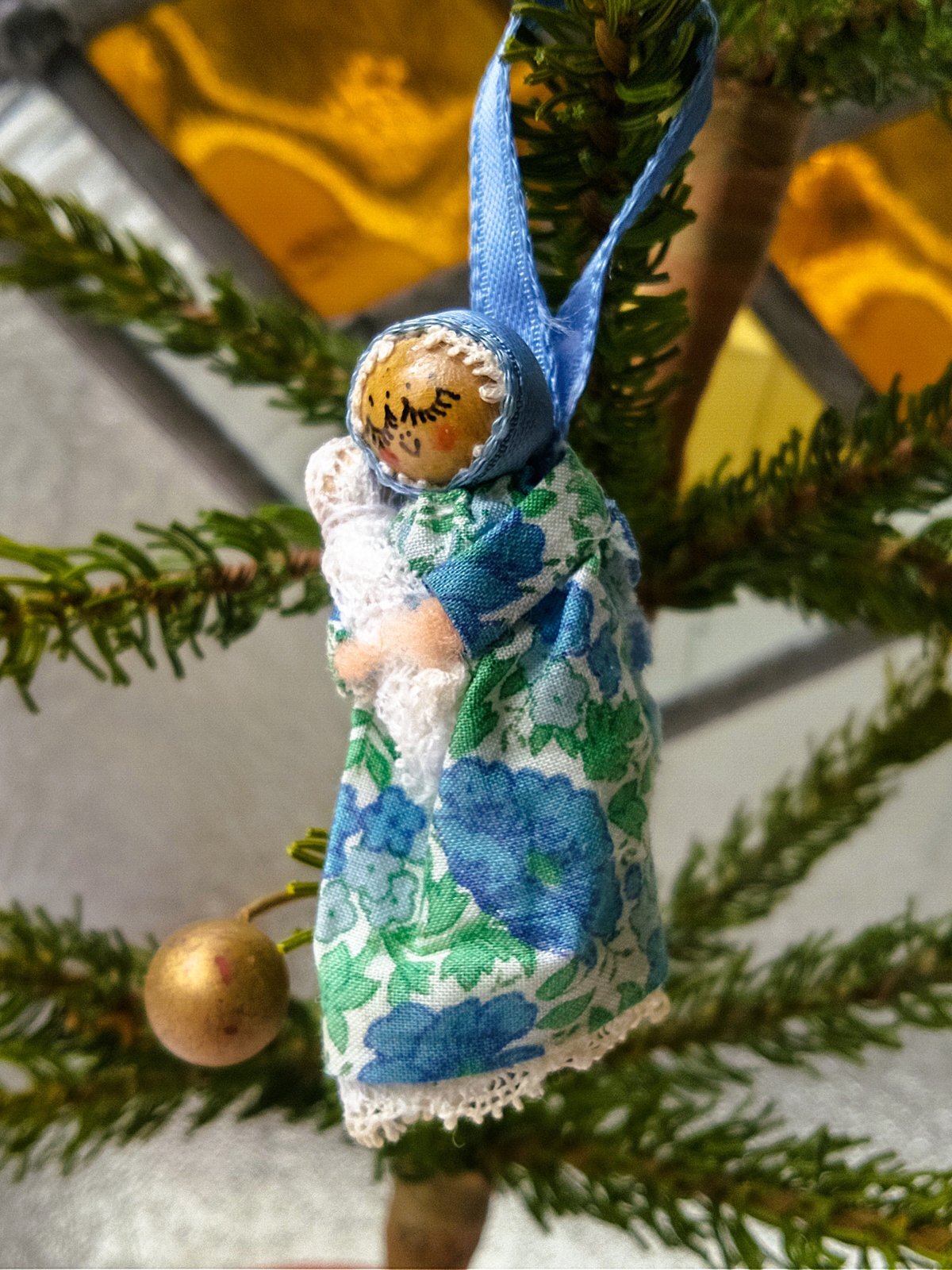 80年代に ロンドンのリバティ百貨店で販売されていました。こちらは リボンがついたハンギング用オーナメント仕様になっています。どちらもベビーを抱いていますよ。丸い頬とハッピースマイルが可愛らしいですね。