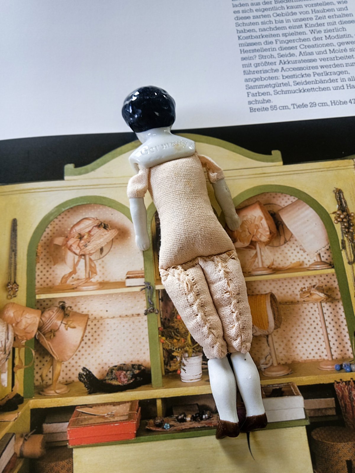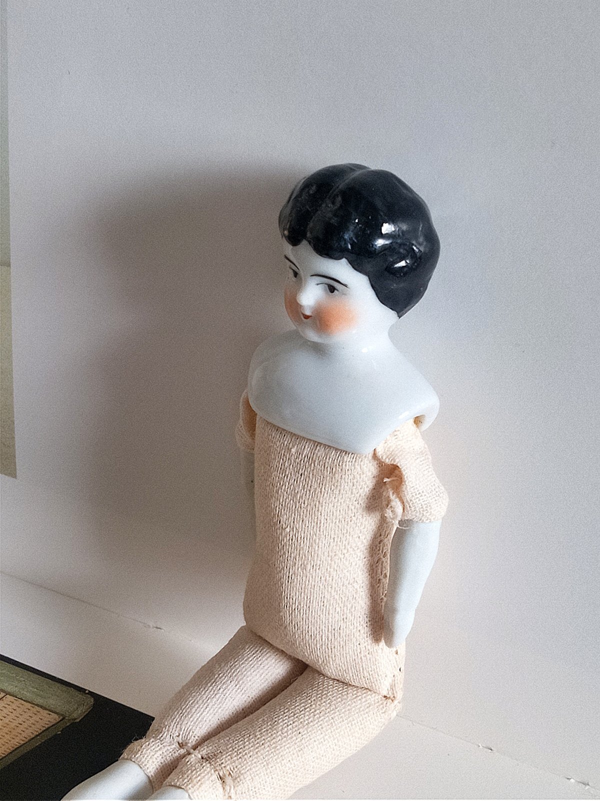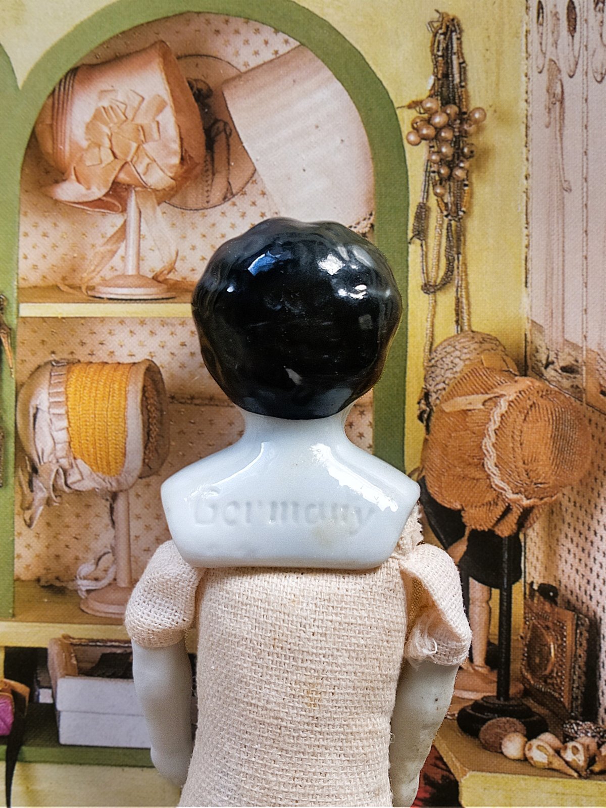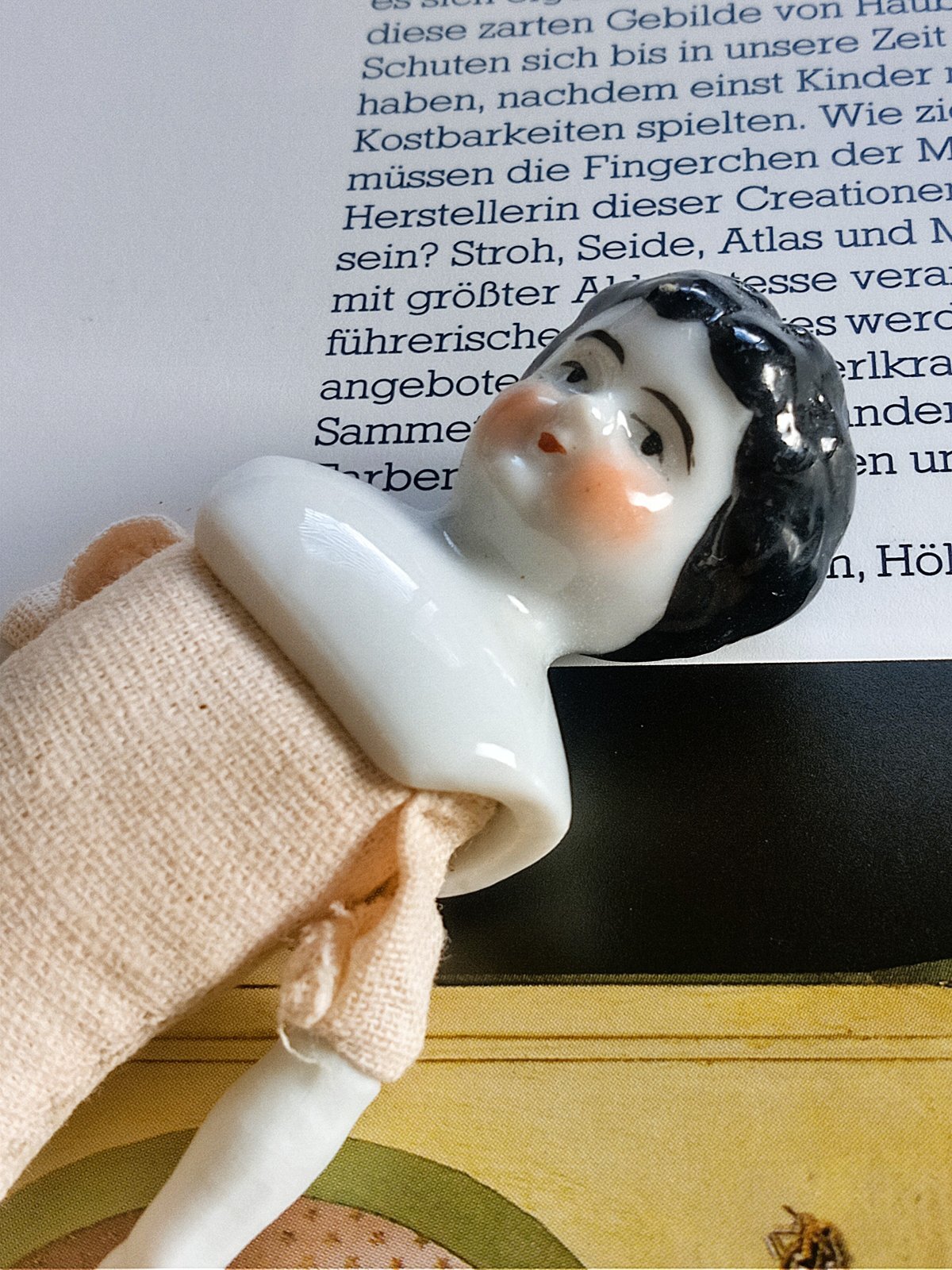 胸までのヘッドは白磁 ビスクの手足 ボディは木毛の詰め物 目の粗いリネン 身長約12,5cm ペイント仕上げ 19世紀後半〜20世紀初期 ドイツ 背中に Germany のエンボス印