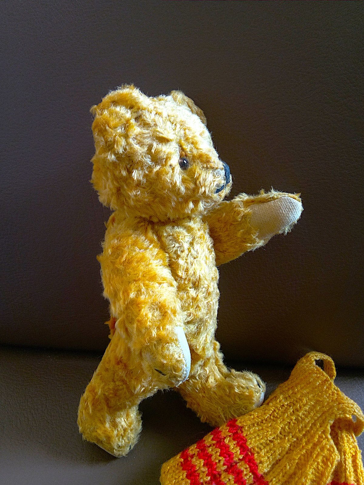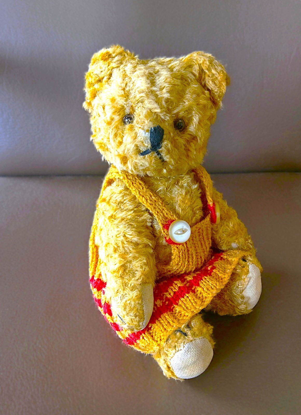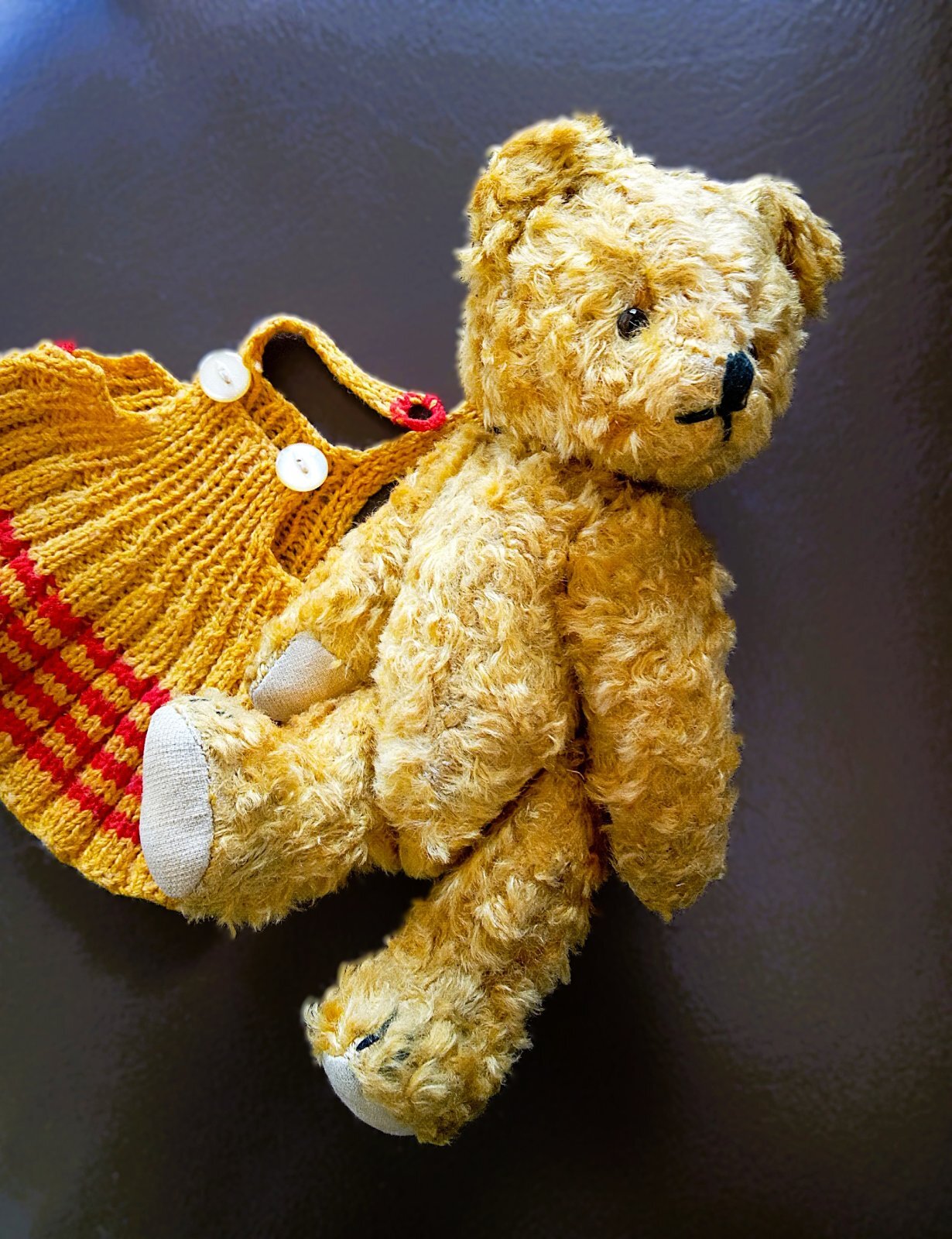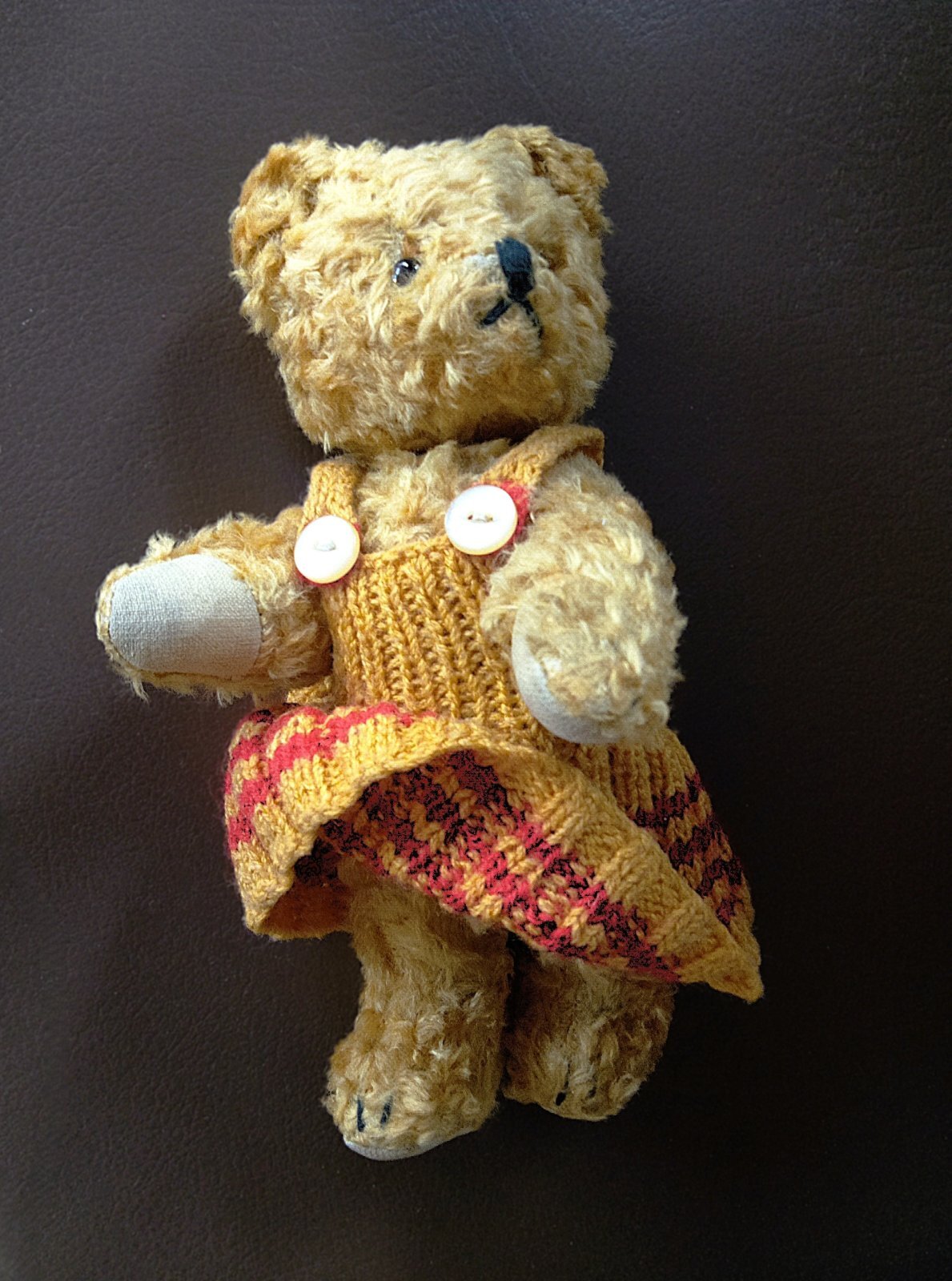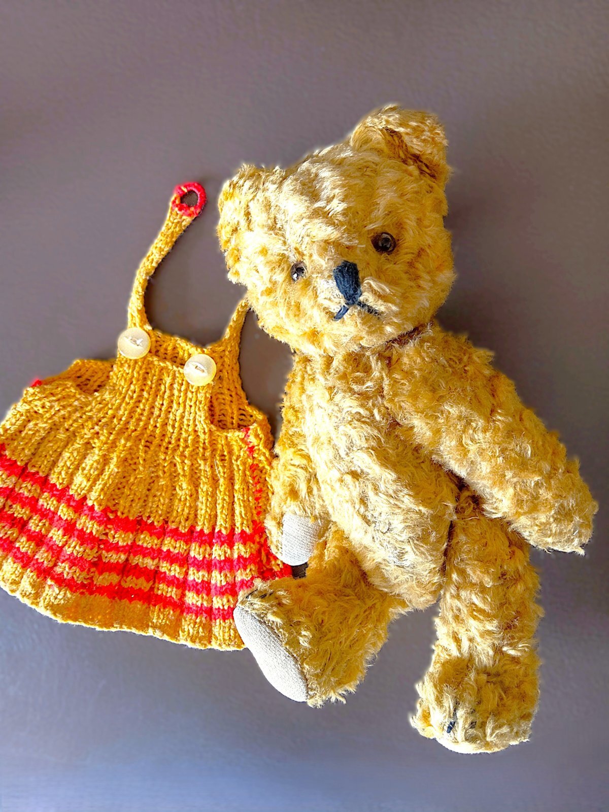 年代相応のこなれ感・うすよごれあります。毛足はご覧の通りうねってよれていたり 丸まったりしてますが、ヴィンテージらしい風合いです。体の詰め物のへたりや型崩れはありません。ボタンどめのニットの吊りスカートは、当時誂えられたものです。お似合いね。