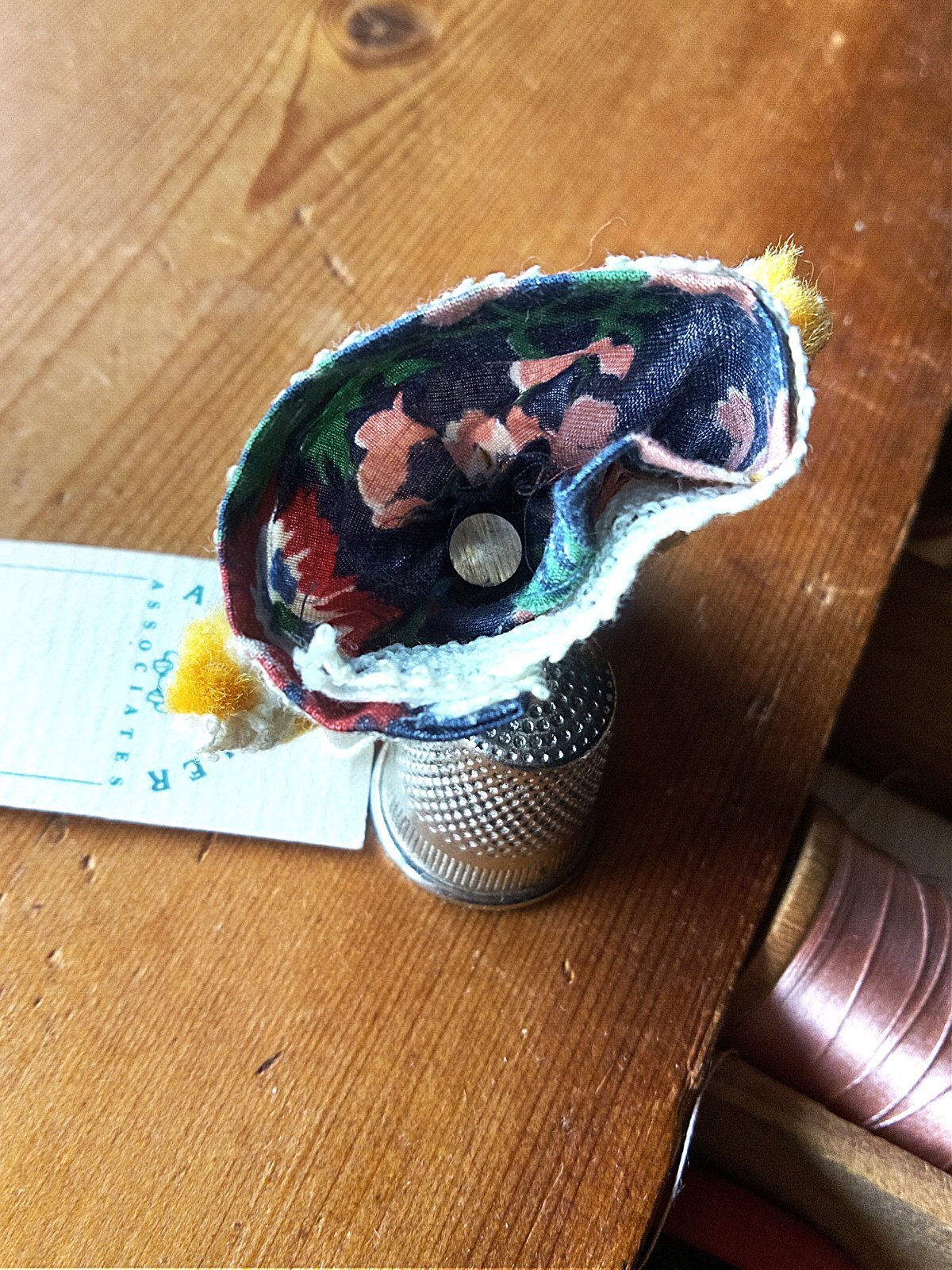 80年代に ロンドンのリバティ百貨店で販売されていました。こちらは ドレスの中にセットされたマグネットにシンブルがくっついて収納されます。