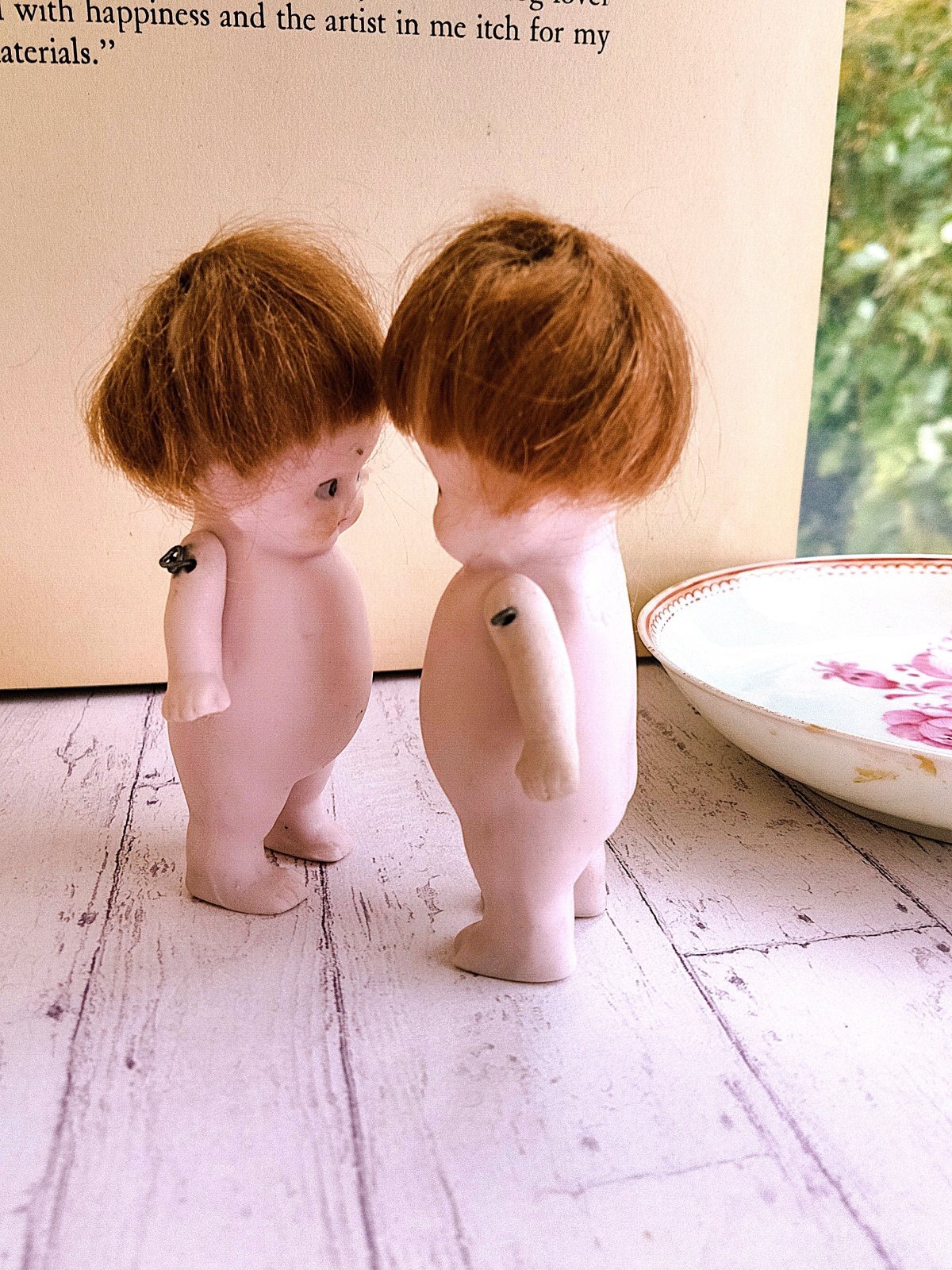 ひとり背中に製陶時にできた粒状の凸がある以外には、どちらもビスクの肌はざらつきなく滑らかで 外観を損なうようないたみはないようです。大事にされてきた良いアンティークコンディションですよ。
