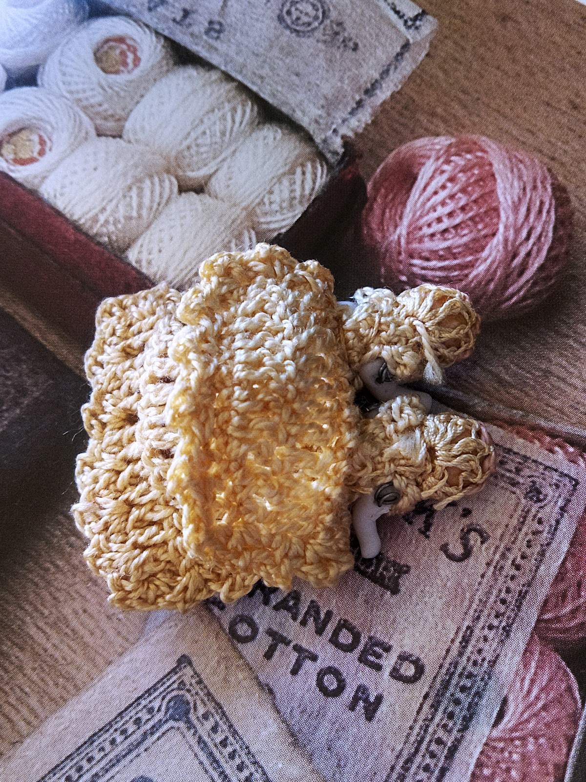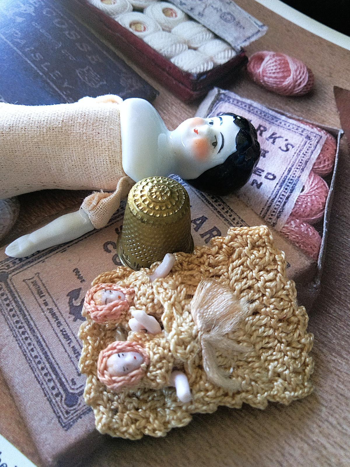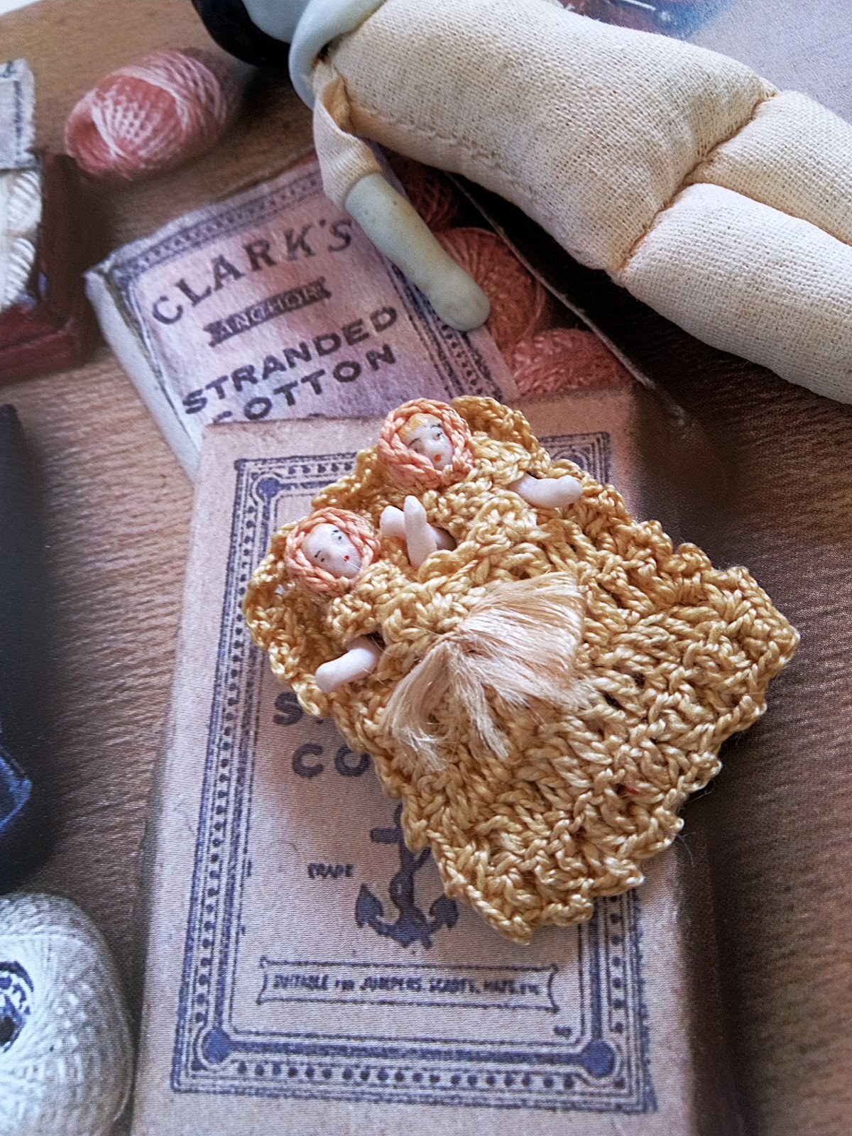 指でつまみあげられるほどの小ささは、ドールハウスのおもちゃ箱の中に入れられるほど ふたりともピンクのボンネットをかぶり、ブランケットの中に入っています。どんなふうに遊ばれていたのでしょうね。とてもていねいに編み込まれています。