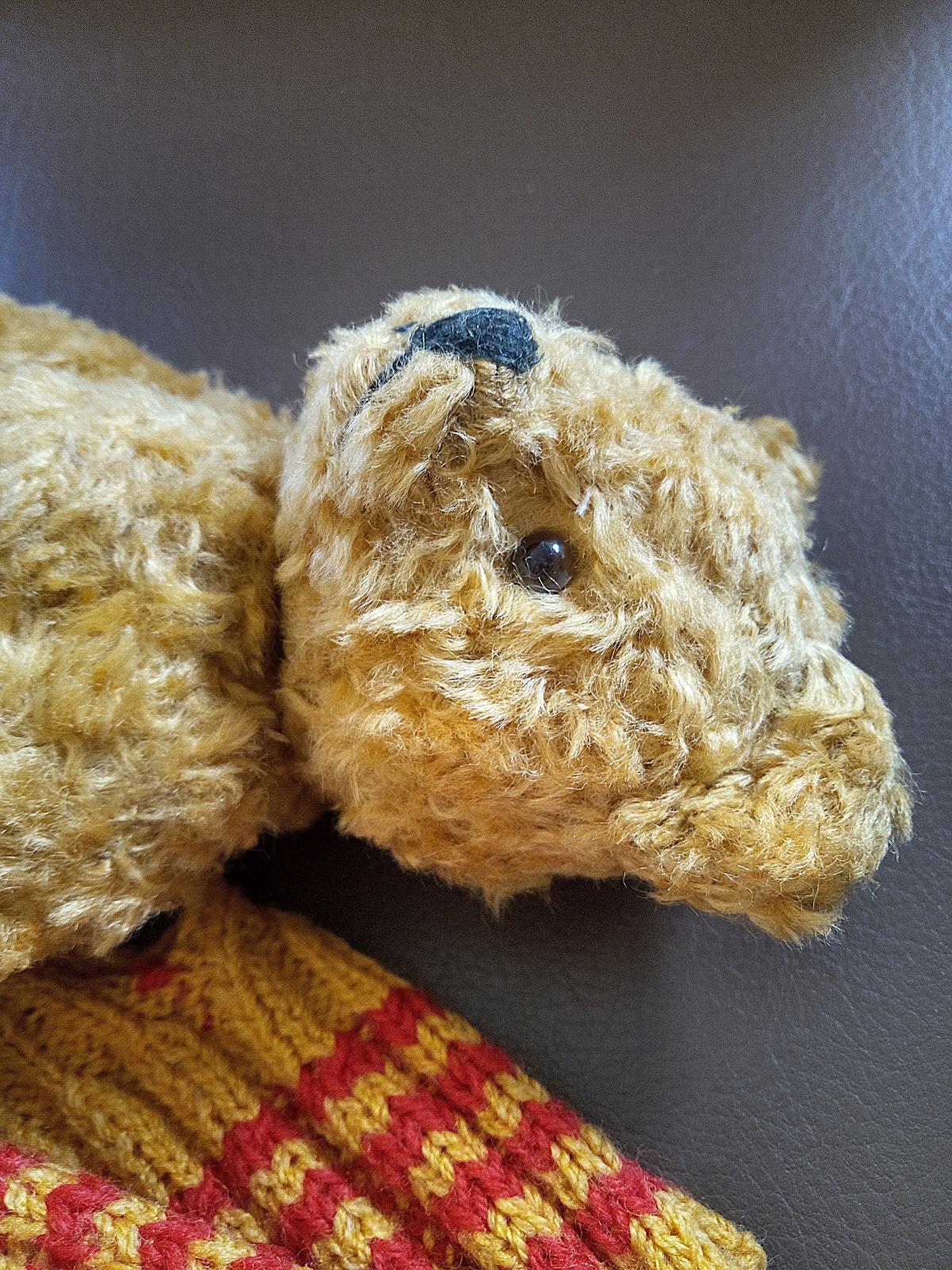 年代相応のこなれ感・うすよごれあります。毛足はご覧の通りうねってよれていたり 丸まったりしてますが、ヴィンテージらしい風合いです。体の詰め物のへたりや型崩れはありません。