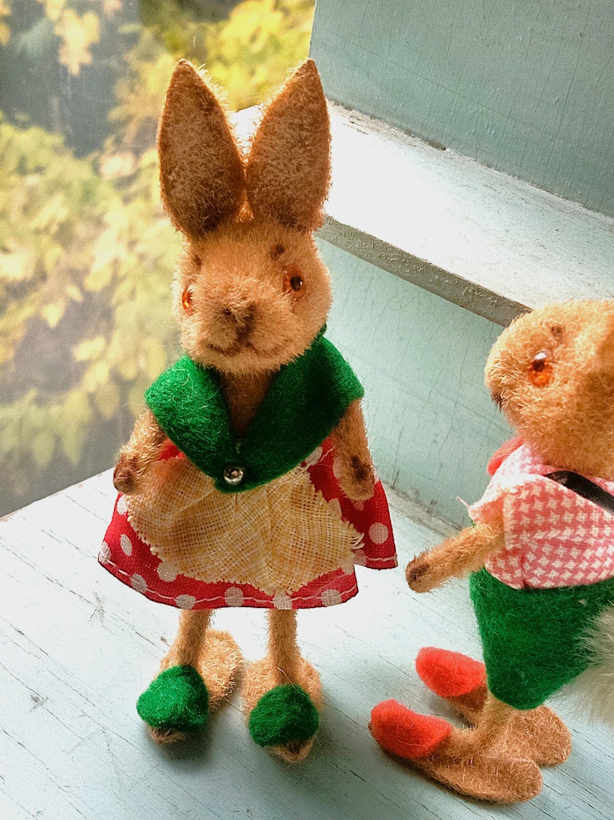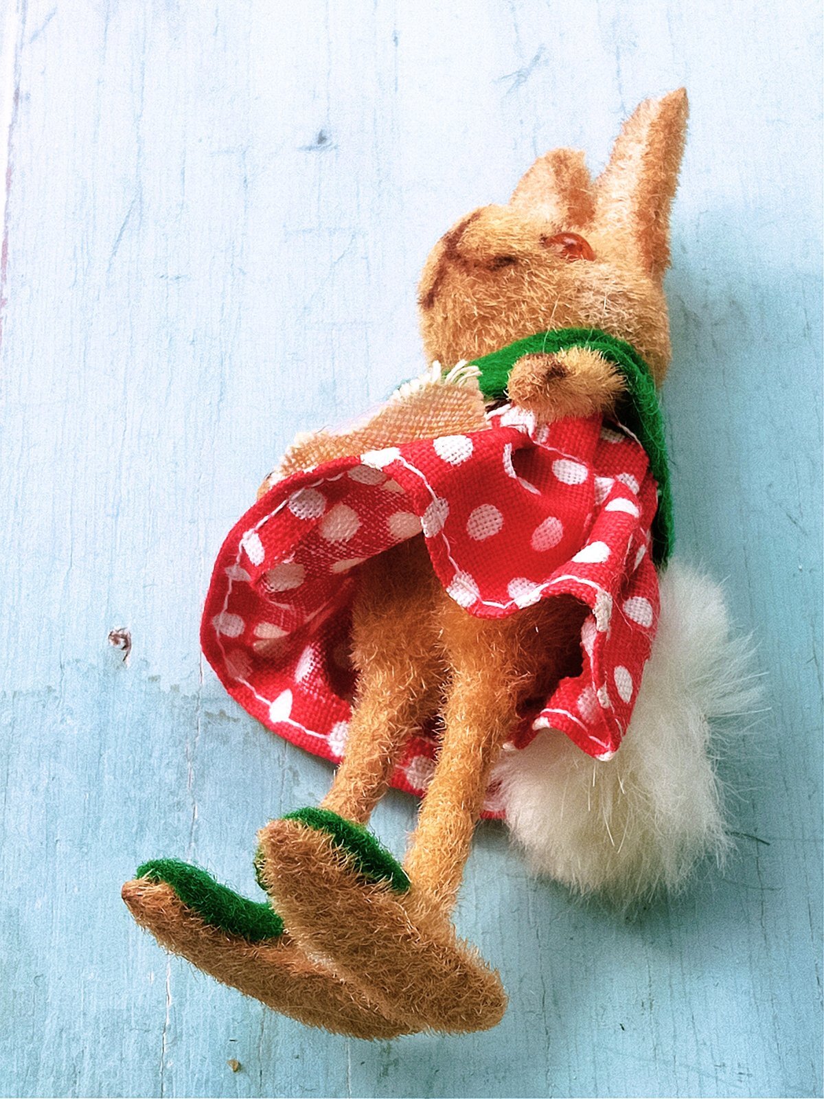 赤い水玉スカートにエプロンして、フエルトの肩掛けを羽織っています。可愛いドレスアップですね。細い脚ですが、スリッパのような大きな靴のおかげで自立しますよ。